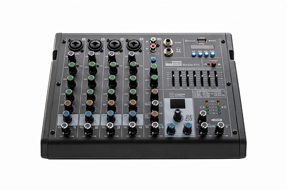MiniStar 41FX функциональный и компактный аналоговый микшер для небольших площадок. 4 микрофонных входа на комбинированных разъемах и отдельный канал для стереоисточника позволят подключить сразу несколько микрофонов/инструментов, а встроенный процессор эффектов и графический эквалайзер - добавить звучанию красок. Добавьте функцию Bluetooth и MP3-плеер для воспроизведения плейбэка и вы получите профессиональное, но недорогое решение для звукоусиления.