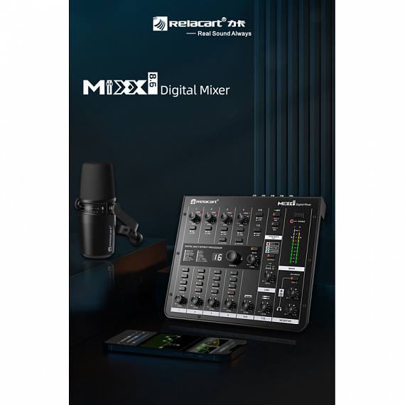 Relacart MIXX8.6 — это компактный и доступный по цене цифровой микшер с 8 входами и 6 выходами. Он имеет DSP-обработку, включая эквалайзер, компрессор и другие эффекты. С помощью USB-интерфейса можно передавать аудиосигнал на мобильные телефоны и компьютеры. Есть 16 эффектов реверберации. А также приложение для Windows.