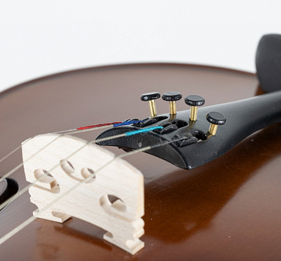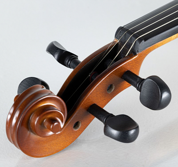 Верхняя дека скрипки изготовлена из резонансной ели, легкой и прочной древесины, высушенной в течении нескольких лет. Для задней деки и обечайки используется из жесткой древесины клена. Машинки на каждой струне облегчают игру начинающим скрипачам.