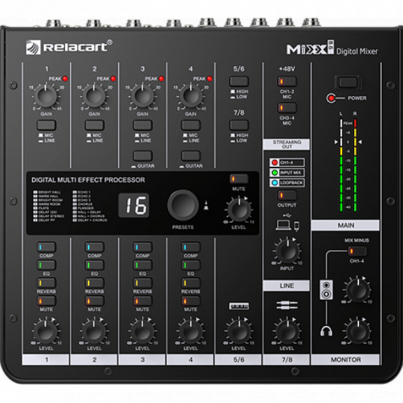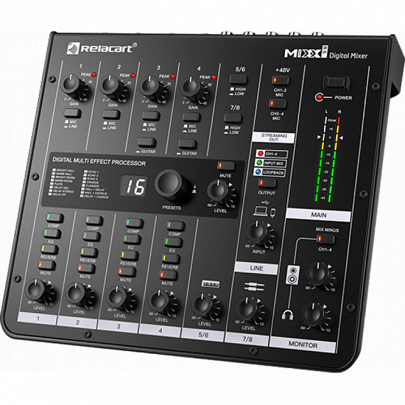 Relacart MIXX8.6 — это компактный и доступный по цене цифровой микшер с 8 входами и 6 выходами. Он имеет DSP-обработку, включая эквалайзер, компрессор и другие эффекты. С помощью USB-интерфейса можно передавать аудиосигнал на мобильные телефоны и компьютеры. Есть 16 эффектов реверберации. А также приложение для Windows.