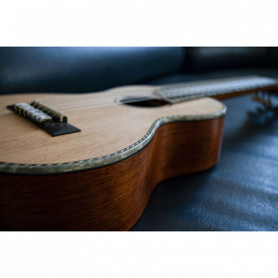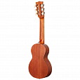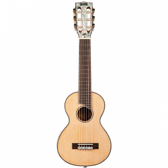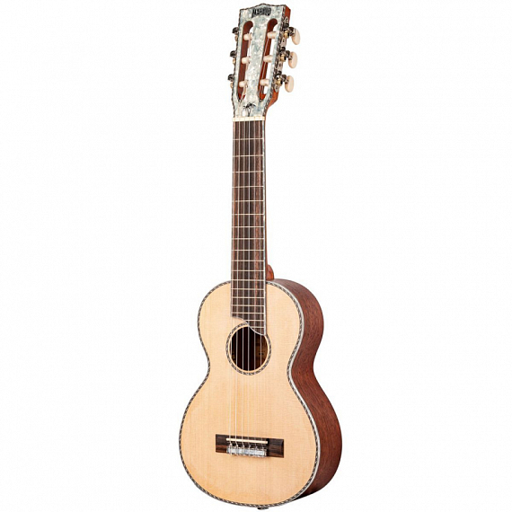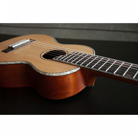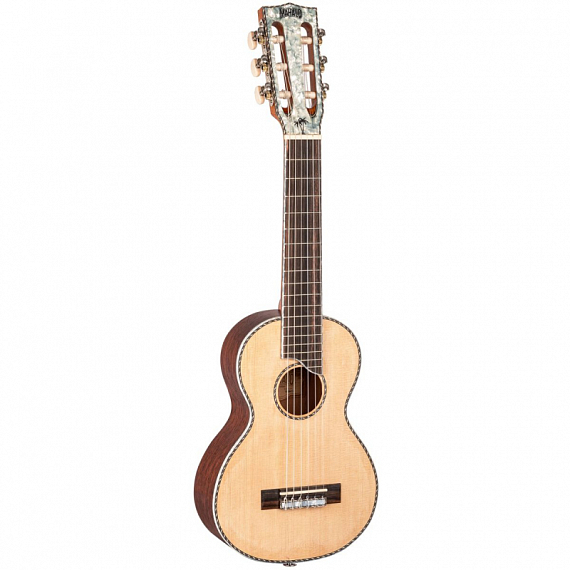 Верхняя дека гиталеле выполнена из массива ели. Нижняя дека, обечайка и гриф изготовлены из красного дерева. Накладка грифа из черного дерева обеспечивает отличный отклик и плавность игры. Отделка с перламутровыми элементами придает инструменту особую эффектность и привлекательность. Модель поставляется в комплекте с прочным чехлом.