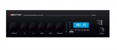 ВЕКТОР ТУ-120М -- комбинированный микшер-усилитель. Мощность 120Вт. Выход 100В\4-16Ом, 1 микр и 2 AUX входа, 1 AUX выход. Цифровой FM тюнер, MP3 плеер, USB, SD, Bluetooth